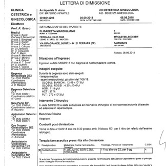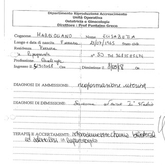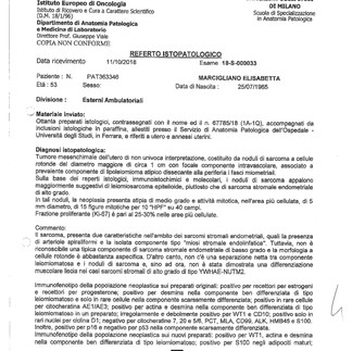 Elisabetta subisce un intervento chirurgico programmato in classe A, d'urgenza, dopo il ricovero del mese precedente in cui venne diagnosticata una neoformazione uterina di natura da determinarsi. L'operazione venne effettuata con colpotomia circolare e morcellazione del pezzo operatorio: la neoformazione conteneva un sarcoma, incapsulato, di stadio I.